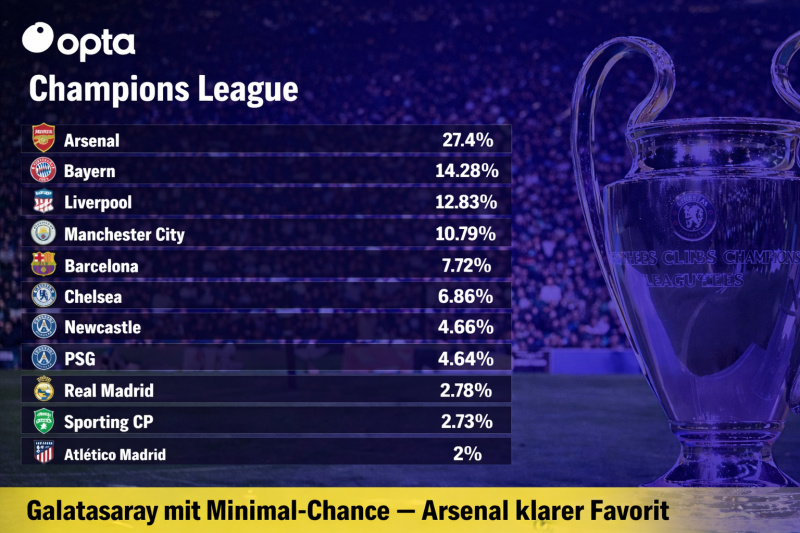 Die neue Wahrscheinlichkeitsanalyse von Opta Analyst sorgt in Fußball-Europa für Diskussionen. Laut den aktuellen Berechnungen liegen die Titelchancen von Galatasaray in der laufenden Champions-League-Saison bei lediglich 0,17 Prozent. Damit rangieren die Istanbuler im unteren Bereich des Rankings – deutlich hinter den etablierten Topklubs des Kontinents.